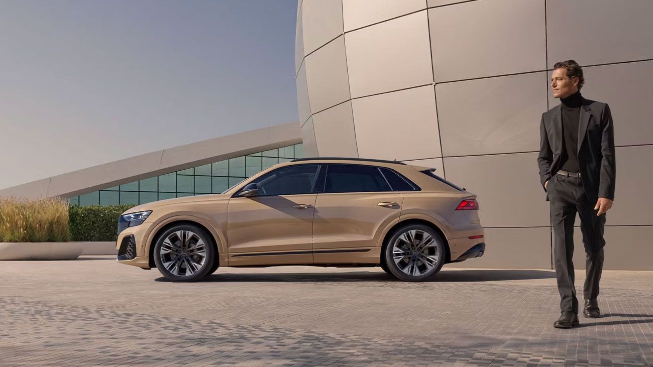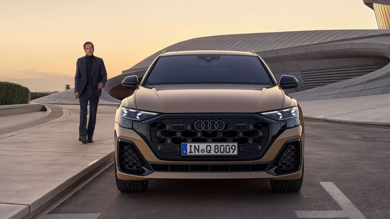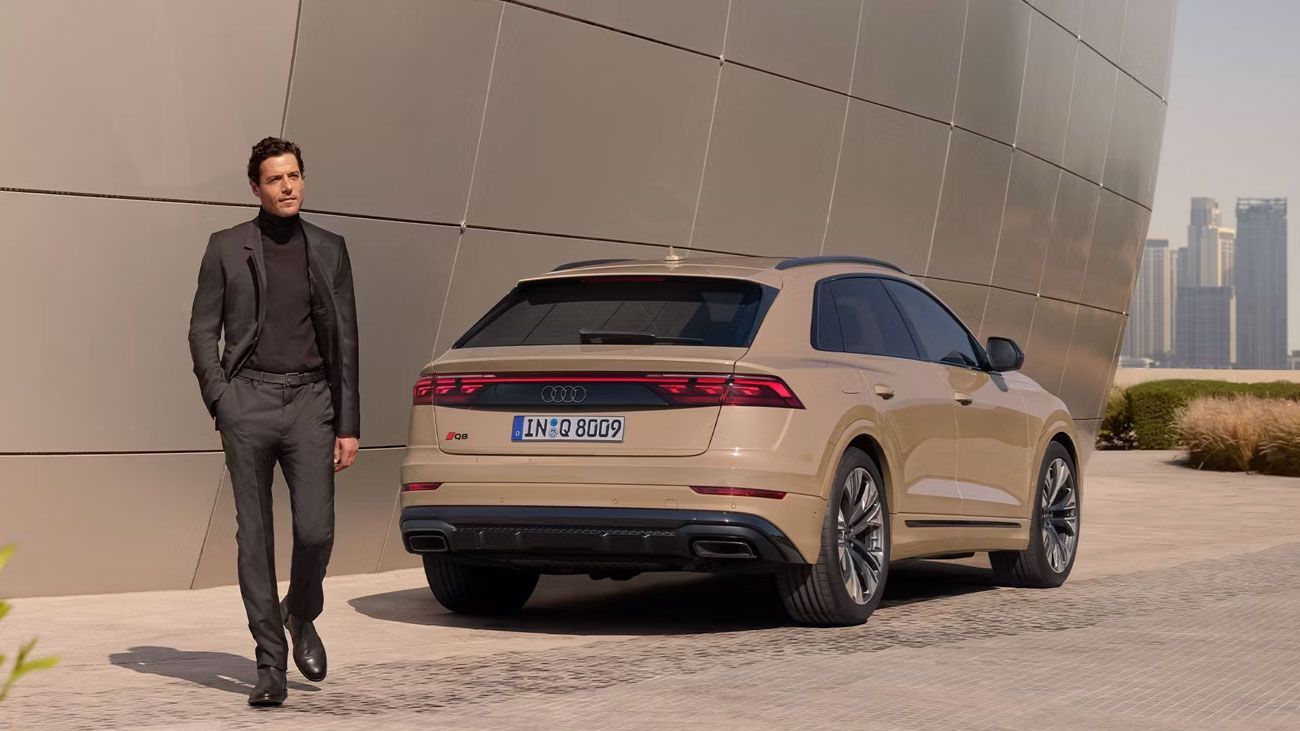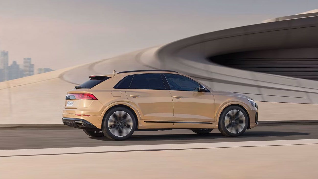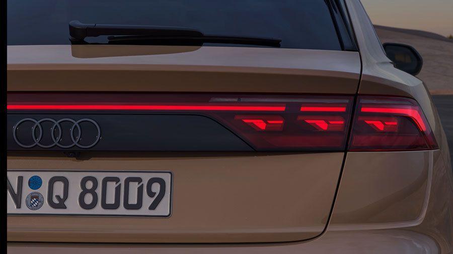 Audi Q8 thể hiện bản lĩnh chinh phục mọi địa hình với kiến trúc quattro huyền thoại cùng đường gân dập nổi mạnh mẽ trên thân xe. Thiết kế vòm trần xe vuốt dốc về phía sau một cách thanh lịch, kết hợp cùng lưới tản nhiệt Singleframe đặc trưng, logo Audi dạng 2D sắc nét và gói ngoại thất S line tạo nên diện mạo thể thao đầy ấn tượng.